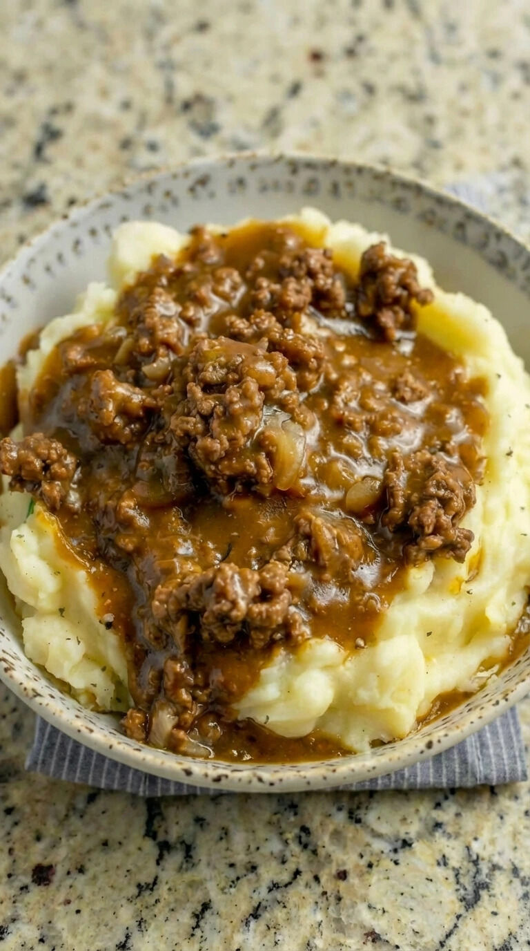 🍽️ Ground Beef and Gravy Over Mashed Potatoes – Classic Comfort Food Dinner